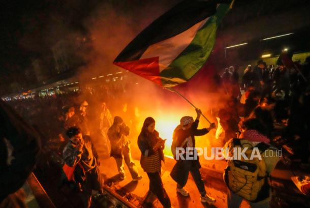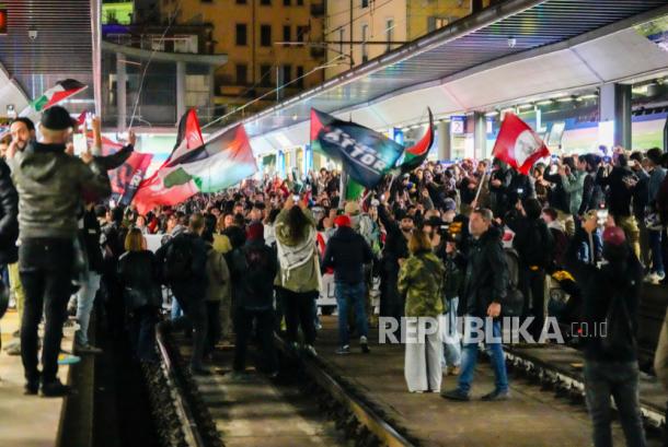 Demonstran pro-Palestina membanjiri jalur kereta api di stasiun kereta Cadorna Milan, Italia, Rabu malam, 1 Oktober 2025, setelah berita bahwa armada bantuan menuju Gaza dicegat oleh pasukan Israel. – (AP Photo/Luca Bruno)