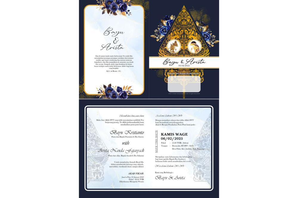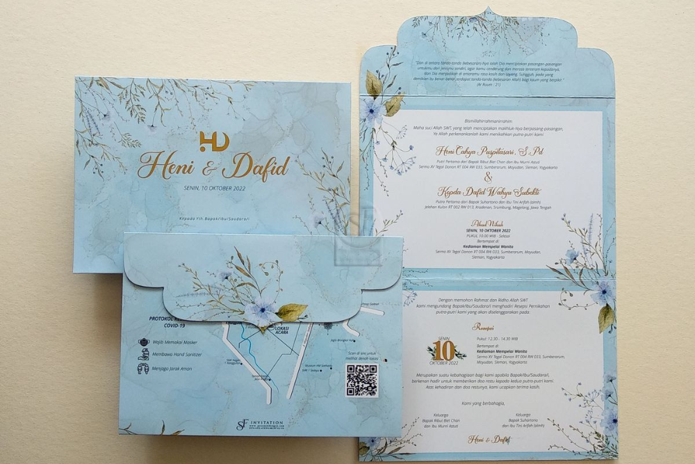 Undangan berdesain lipat dengan nuansa biru jadi alternatif yang tepat untuk digunakan pada desain undangan ngunduh mantu. Warna nya memberi kesan simpel, namun tetap estetik. Untuk informasi pada undangan, pastikan menggunakan huruf yang jelas, dengan menonjolkan tanggal, waktu, dan lokasi acara. -