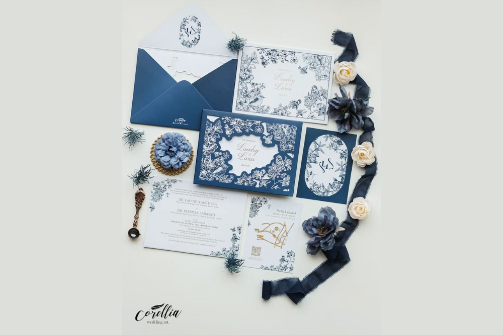 Paduan warna biru gelap dan putih, ditambah ilustrasi bunga yang estetik seperti contoh satu ini dapat memberikan kesan yang berkelas. Dengan mengkombinasikan jenis huruf pada informasi undangan, akan memberikan tampilan yang seimbang dan spesial. -