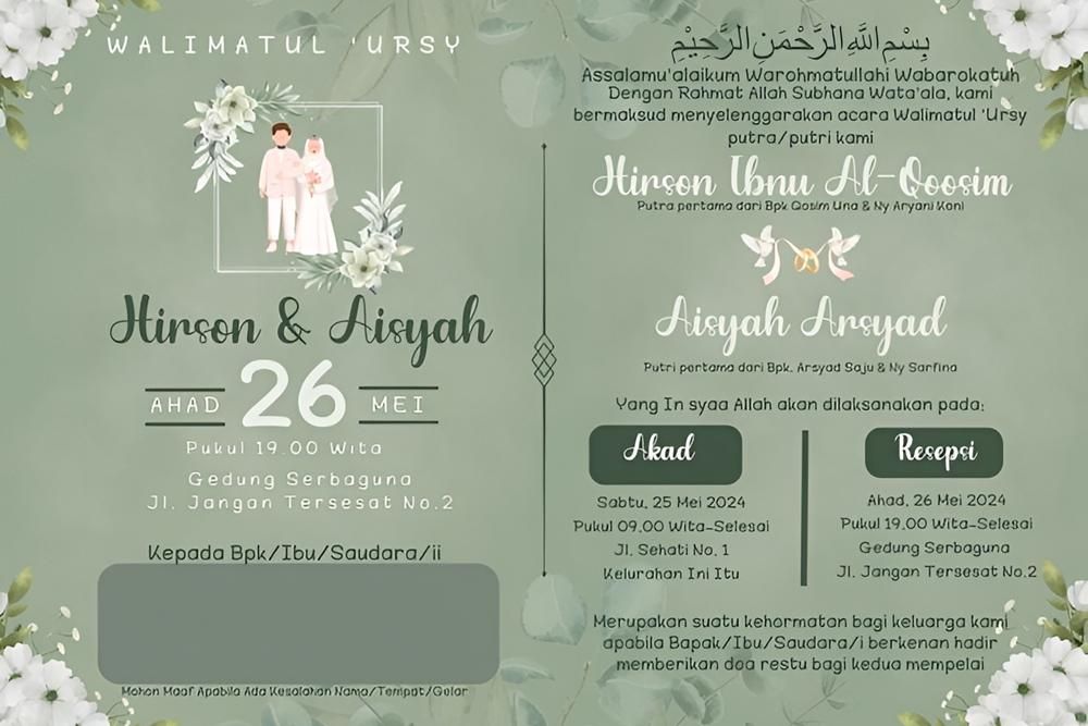 Selanjutnya, apabila ingin mengusung nuansa Islami pada undangan, contoh berikut ini tentunya sangat sesuai untukmu. Desainnya sederhana dengan penggunaan warna yang kalem. Supaya semakin menarik, jangan lupa untuk memberi tambahan animasi pengantin faceless di bagian depan undangannya. -