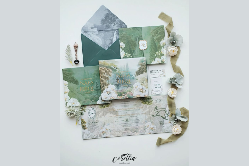 Contoh undangan ngunduh mantu selanjutnya yakni menggunakan nuansa earth tone. Paduan warna hijau, putih, dan coklat menciptakan kesan yang sederhana, sekaligus elegan. Tentunya cocok jika kamu dan pasangan ingin tampilan undangan yang lebih netral. Dengan tambahan ilustrasi bunga dan pemandangan alam dapat membuat undangan jadi tampak semakin spesial. -