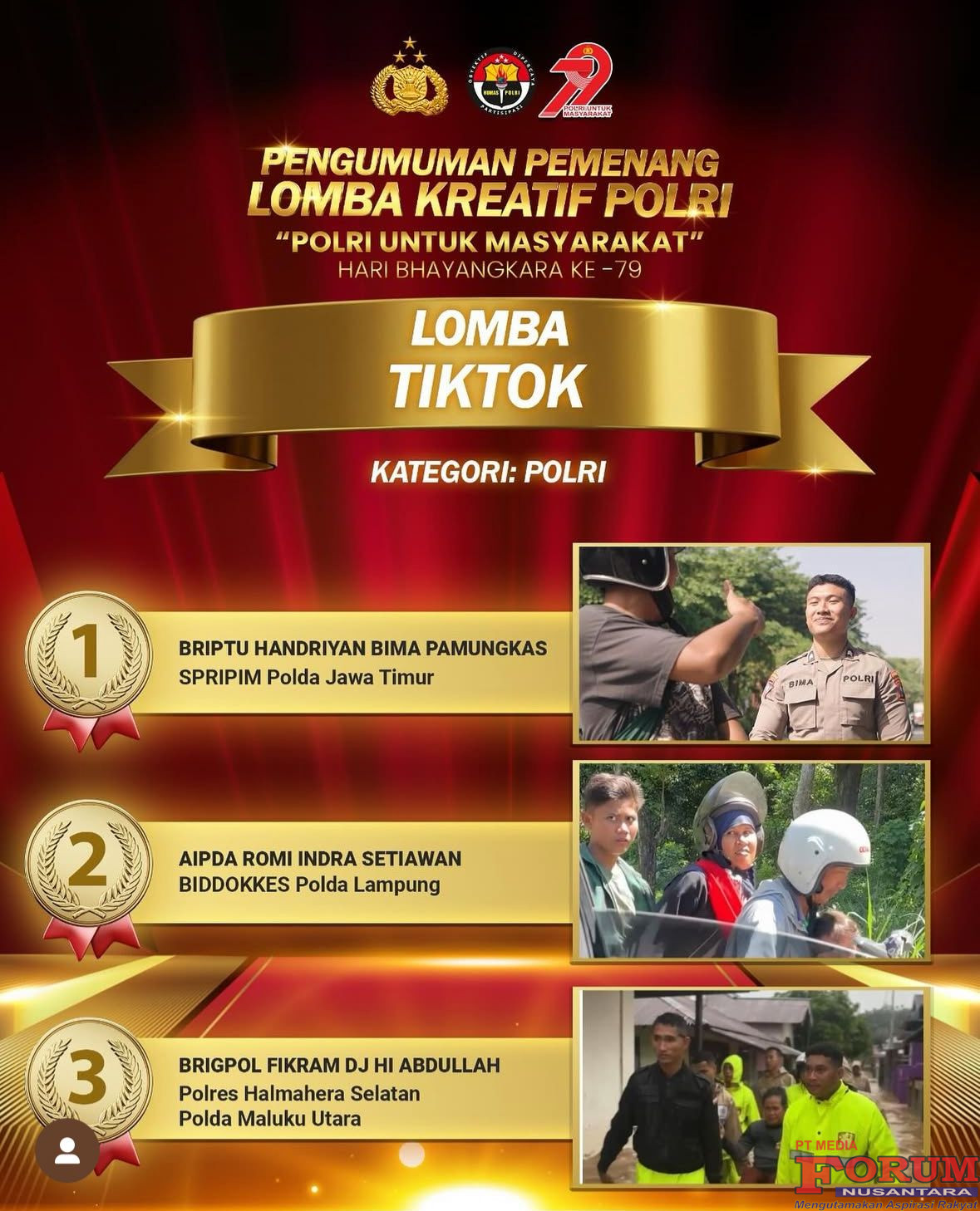 ForumNusantaranews.com Lampung– Aipda Romi Indra dari Satker Biddokes Polda Lampung berhasil meraih Juara 2 Lomba Konten Kreator TikTok Kategori POLRI yang diselenggarakan oleh Divisi Humas Polri dalam rangka Hari Bhayangkara ke-79. Selasa(8/7/25)
