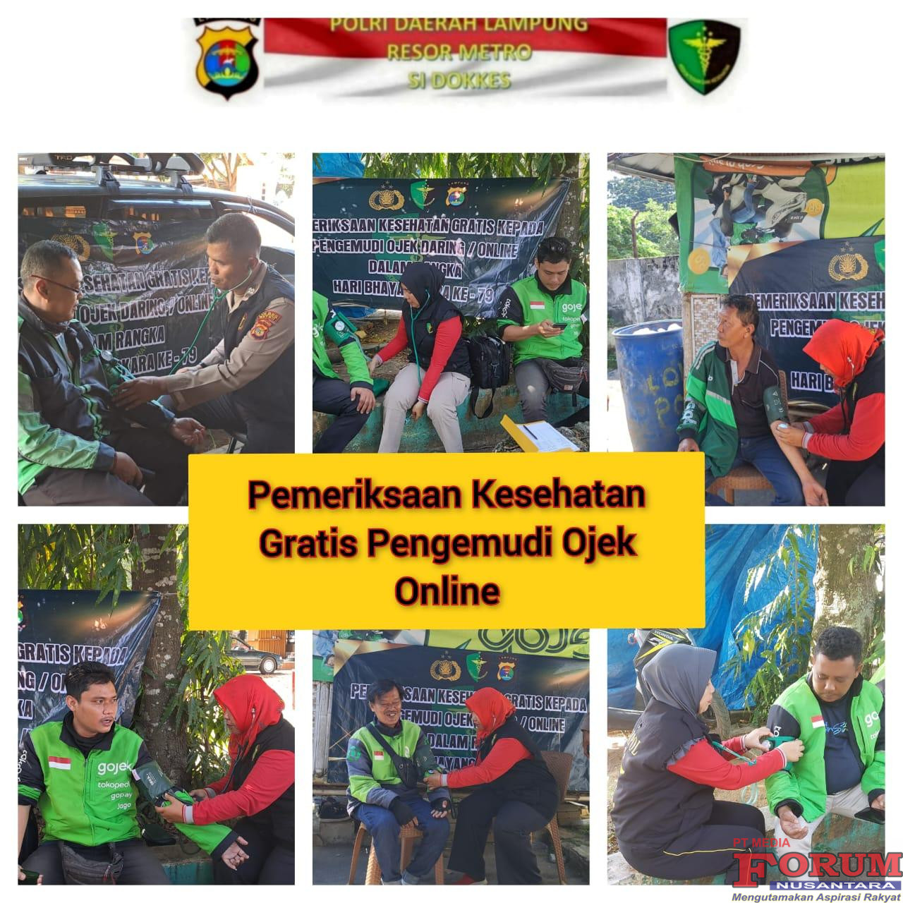 ForumNusantaranews.com LAMPUNG – Dalam rangka memperingati Hari Ulang Tahun (HUT) Bhayangkara ke 79, Biddokkes Polda Lampung melaksanakan kegiatan bakti sosial dengan tema ‘Pemeriksaan Kesehatan Gratis untuk Pengemudi Ojek Online’. Kegiatan ini merupakan salah satu bentuk kepedulian Polri terhadap masyarakat, khususnya pengemudi ojek online yang sering kali berhadapan dengan risiko kesehatan di jalan.