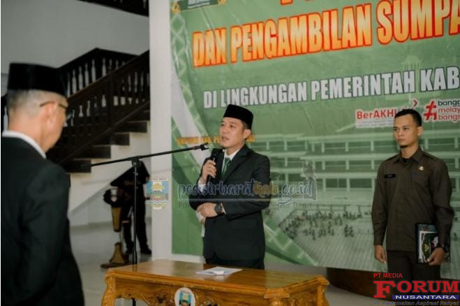 ForumNusantaranews.com PESISIR BARAT- Bupati Pesisir Barat, Dedi Irawan kukuhkan sekaligus melantik Pejabat Pimpinan Tinggi Pratama dan Pejabat Administrator di Lingkungan Pemerintah Kaupaten Pesisir Barat, di Lobby Teluk Stabas Lantai 1 Gedung Marga Sai Batin, Rabu (11/03/2026).