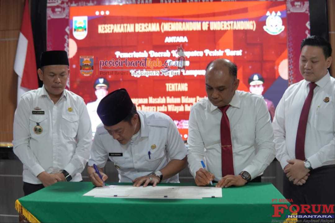 ForumNusantaranews.com PESISIR BARAT-Bupati Pesisir Barat (Pesibar), Dedi Irawan menghadiri kegiatan penandatanganan Memorandum of Understanding (MoU) antara Pemkab Pesibar dengan Kejaksaan Negeri (Kejari) Lampung Barat (Lambar) tentang Penanganan Masalah Hukum Bidang Perdata dan Tata Usaha Negara (Datun) pada Wilayah Hukum Pesibar, di Aula Kejari Lambar, Rabu (24/6/2025).