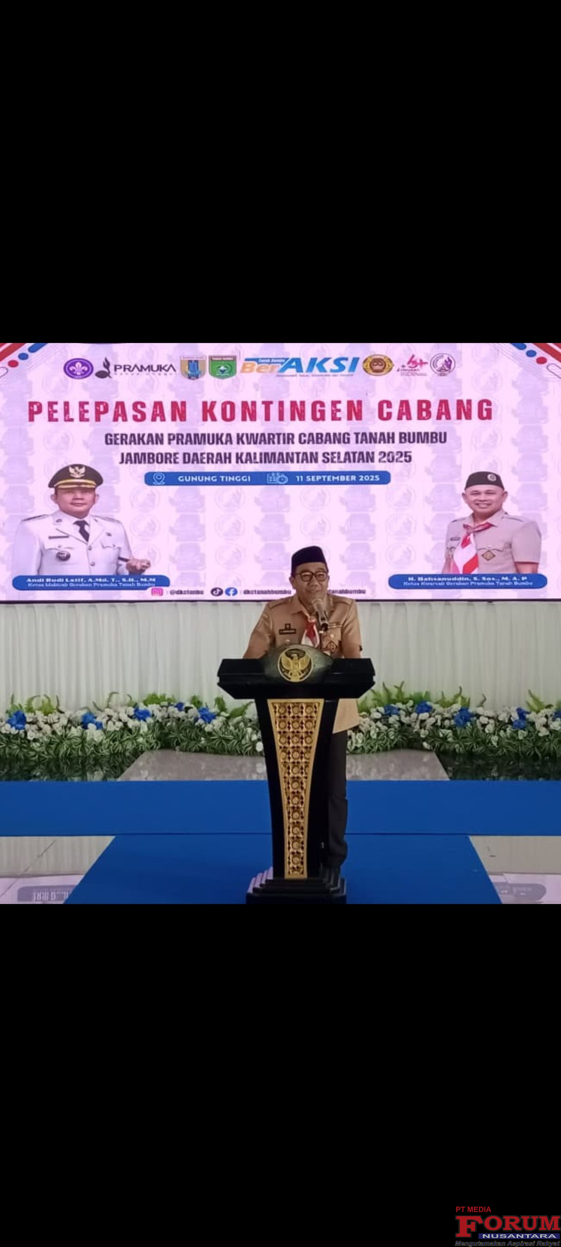 Tanah Bumbu,Kamis 11 September 2025.Bupati Tanah Bumbu Andi Rudi Latif. A.Md.T,SH.MM melalui H.Syamsudin.S,Sos,MM Kepala Dinas Kebudayaan Pemuda,Olahraga dan Pariwisata (Disbudporpar) Kabupaten Tanah Bumbu secara resmi melepas 70 anggota Kontingen Gerakan Pramuka Kwartir Cabang (Kwarcab) Tanah Bumbu menuju Jambore Daerah Gerakan Pramuka Kalimantan Selatan Tahun 2025 di Banjarbaru.pelepasan berlangsung di Pendopo Serambi Madinah,Samping Kantor Bupati Tanah Bumbu Jl.Darmapraja,Kelurahan Gunung Tinggi,Batulicin.Pada Kamis (11/09/2025).