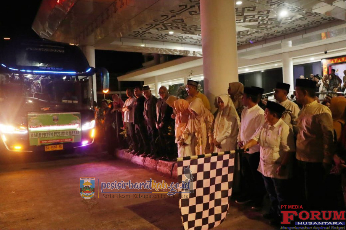 ForumNusantaranews.com PESISIR BARAT-Bupati-Wakil Bupati Pesisir Barat (Pesibar), Dedi Irawan-Irawan Topani, S.H., M.Kn., melepas pemberangkatan 56 jamaah haji Pesibar Tahun 2025, di Komplek Perkantoran Pemkab Pesibar, Rabu (21/5/2025) subuh.