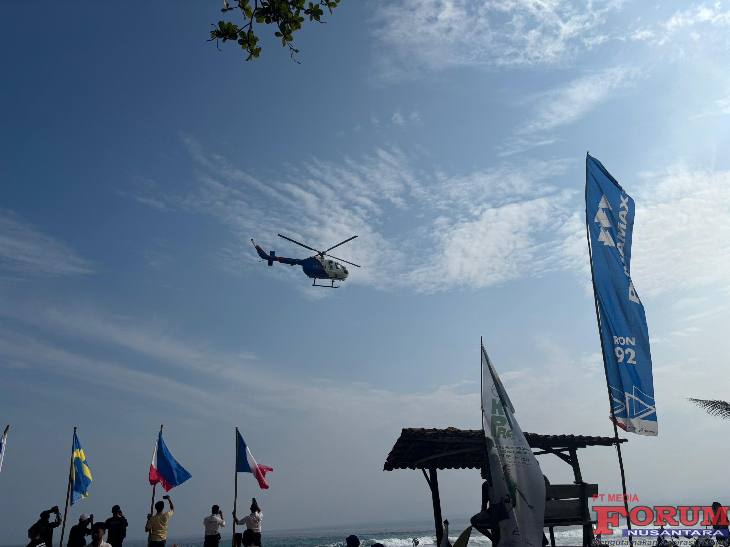 ForumNusantaranews.com Pesisir Barat – Menjamin keamanan dan kenyamanan pelaksanaan World Surfing League (WSL) Krui Pro 2025, Ditpolairud Polda Lampung laksanakan patroli udara menggunakan Helikopter Polri jenis NBO-105 di sekitar kawasan Pantai Nyimbor, Tanjung Setia, Kabupaten Pesisir Barat. Sabtu(14/6/25)