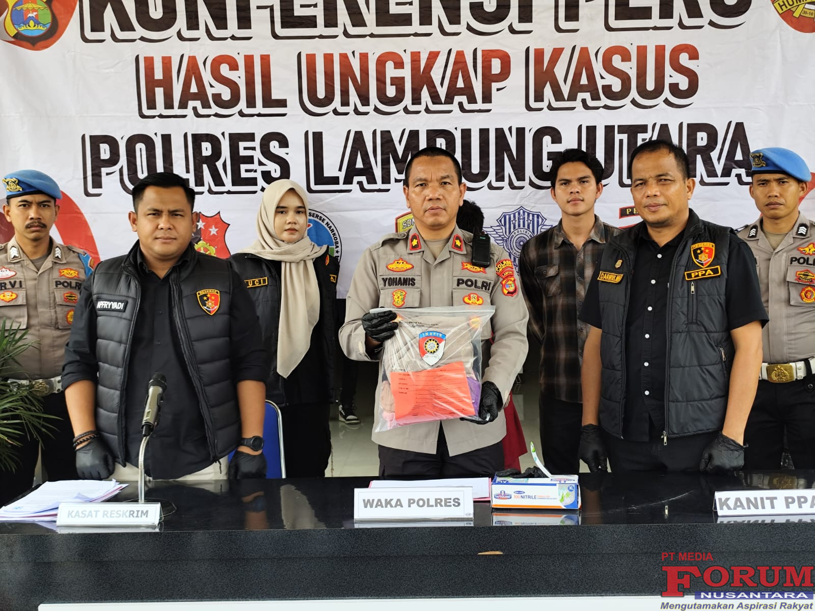 Pengungkap kasus tersebut disampaikan oleh Kapolres Lampung Utara AKBP Deddy Kurniawan melalui Wakapolres Kompol Yohanis saat menggelar Konferensi Pers didampingi Kasat Reskrim AKP Apfryyadi, Kamis (25/9/25).