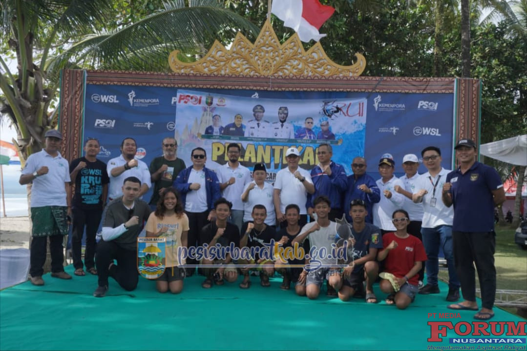 ForumNusantaranews.com PESISIR BARAT-Wakil Bupati Pesisir Barat (Pesibar), Irawan Topani, S.H., M.Kn., menghadiri kegiatan pelantikan Pengurus Persatuan Selancar Ombak Indonesia (PSOI) Provinsi Lampung Periode 2023-2027, di lokasi pelaksanaan World Surf League (WSL) Krui Pro Tahun 2025, di Pantai Karang Nyimbor Pekon Tanjung Setia Kecamatan Pesisir Selatan, Selasa (10/6/2025).