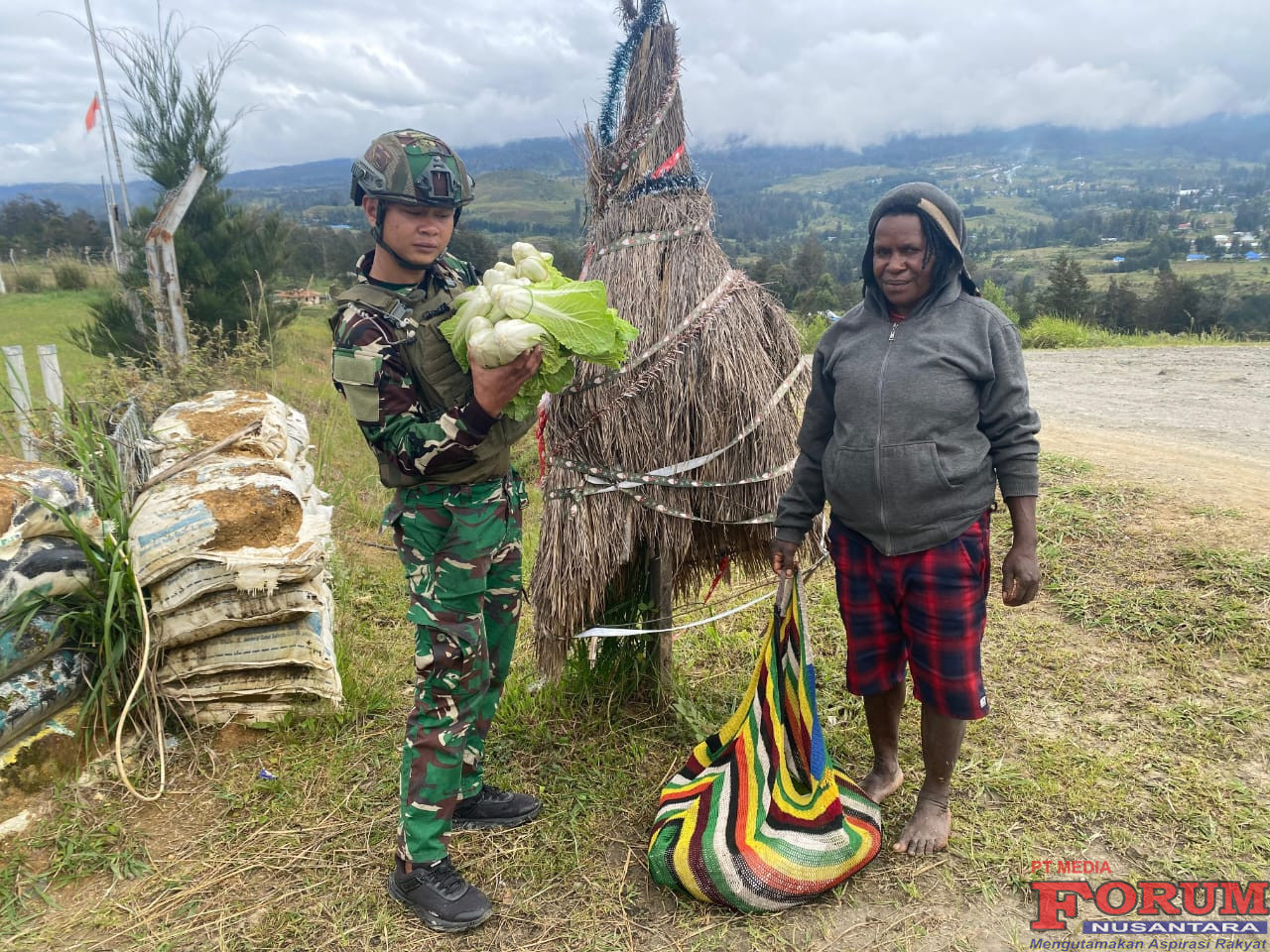 “Sudah lama mama-mama kesulitan jual hasil taninya. Tidak ada pasar, dan kalau pun ada, terlalu jauh dan mahal ongkos. Jadi mereka bawa ke pos, dan kami bantu,” ungkap Letda Inf Herman, Danpos Koper, dengan mata berkaca-kaca.