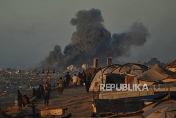 Asap mengepul menyusul serangan militer Israel di Kota Gaza, terlihat dari tengah Jalur Gaza, Rabu, 1 Oktober 2025. – ( AP Photo/Abdel Kareem Hana)