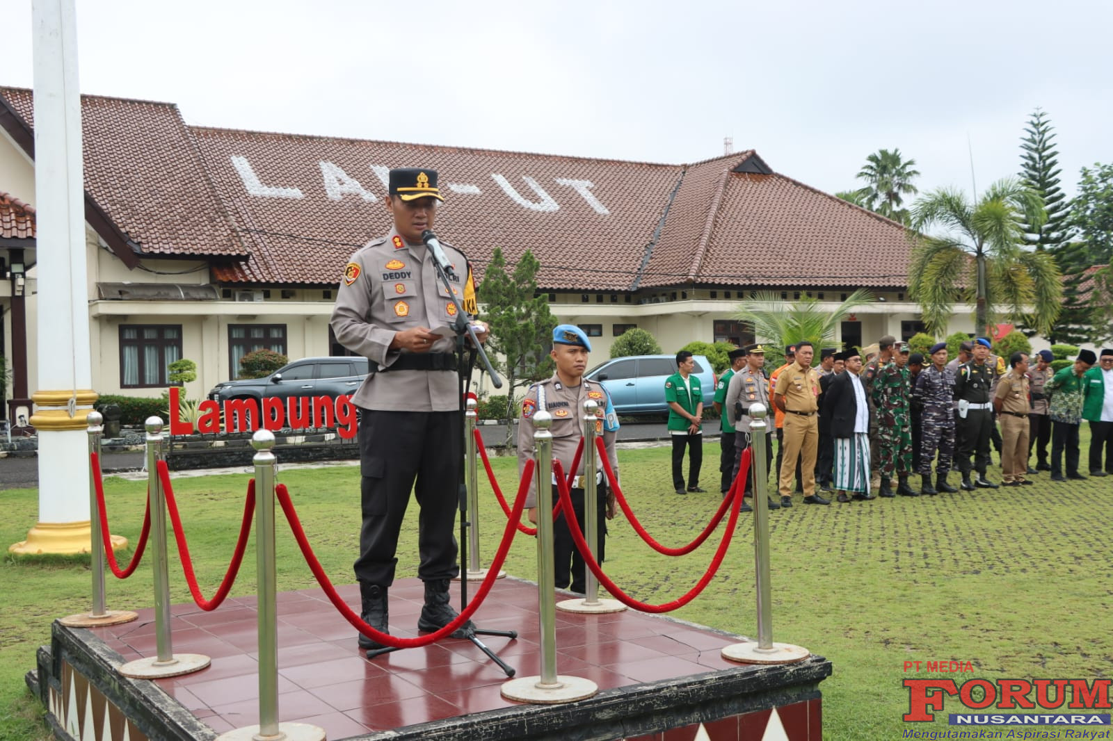 Apel siaga dipimpin langsung oleh Kapolres Lampung Utara, AKBP Deddy Kurniawan, S.H., S.I.K., M.M., M.Si., dan dihadiri Wakil Bupati Lampung Utara, para Pejabat Utama (PJU) Polres, unsur TNI-Polri, Dinas Perhubungan, Satpol PP, Senkom, serta Banser Kabupaten Lampung Utara.