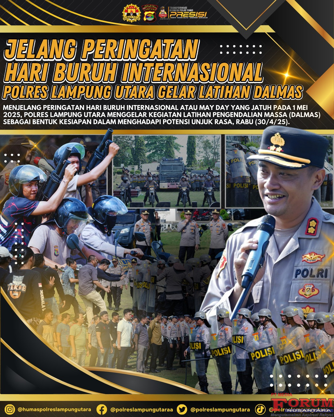 ForumNusantaranews.com LAMPUNG UTARA– Menjelang peringatan Hari Buruh Internasional atau May Day yang jatuh pada 1 Mei 2025, Polres Lampung Utara menggelar kegiatan latihan pengendalian massa (Dalmas) sebagai bentuk kesiapan dalam menghadapi potensi unjuk rasa, Rabu (30/4/25).