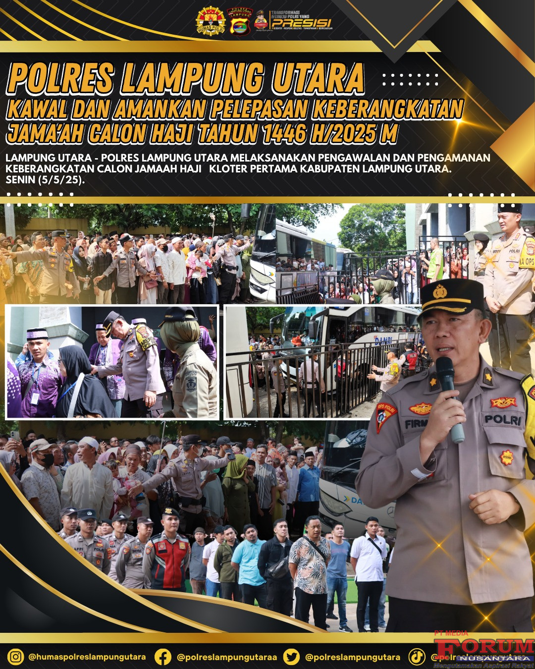 ForumNusantaranews.com LAMPUNG UTARA– Kapolres Lampung Utara AKBP Deddy Kurniawan, S.H., S.I.K., M.M., M. Si. menghadiri kegiatan pelepasan Jamaah Calon Haji asal Kabupaten Lampung Utara yang berlangsung di Gedung Islamic Center Kotabumi, Senin (5/5/25).