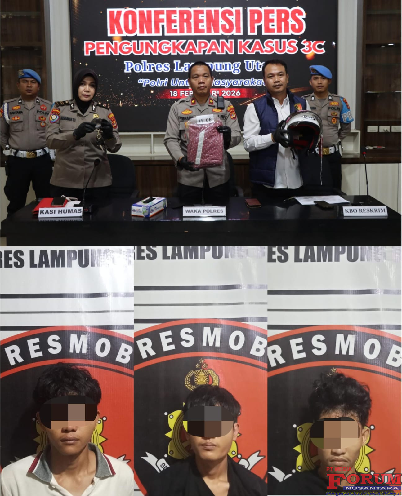 “Setelah menerima laporan, petugas langsung mendatangi tempat kejadian perkara (TKP), melakukan olah TKP, serta mengumpulkan keterangan saksi dan barang bukti, jelas Wakapolres Kompol Yohanis, didampingi Plt Kasi Humas Iptu Herawati dan KBO Sat Reskrim Ipda Wiby saat Konferensi Pers, Rabu (18/2/26).