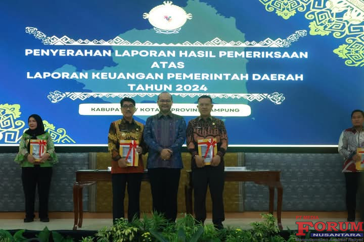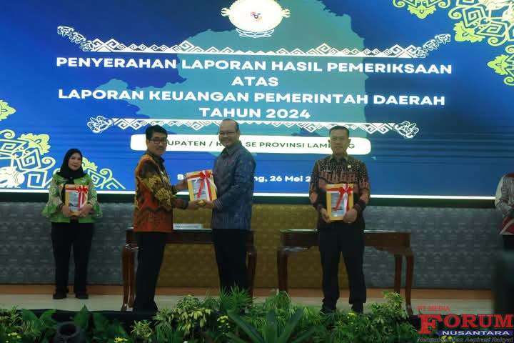 Penyerahan Laporan Hasil Pemeriksaan (LHP) atas LKPD Tahun Anggaran 2024 dilakukan oleh Kepala BPK RI Perwakilan Provinsi Lampung, Nugroho Heru Wibowo, S.E., M.Comm., CSFA, ACPA, CA, Ak., kepada Bupati Lampung Utara, Dr. Ir. H. Hamartoni Ahadis, M.Si., dalam acara resmi yang digelar di Aula Krakatau, Kantor BPK RI Perwakilan Provinsi Lampung, Bandar Lampung, Senin (26/5/2025).