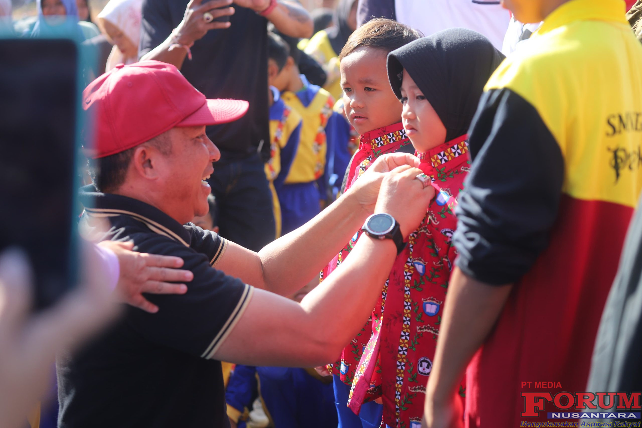 Setelah senam, Bupati Parosil membagikan seragam secara simbolis. Ia bahkan memakaikan langsung seragam batik dan tas baru kepada beberapa siswa terpilih sebuah gestur yang menunjukkan kedekatan dan perhatian seorang pemimpin kepada anak-anak didiknya.