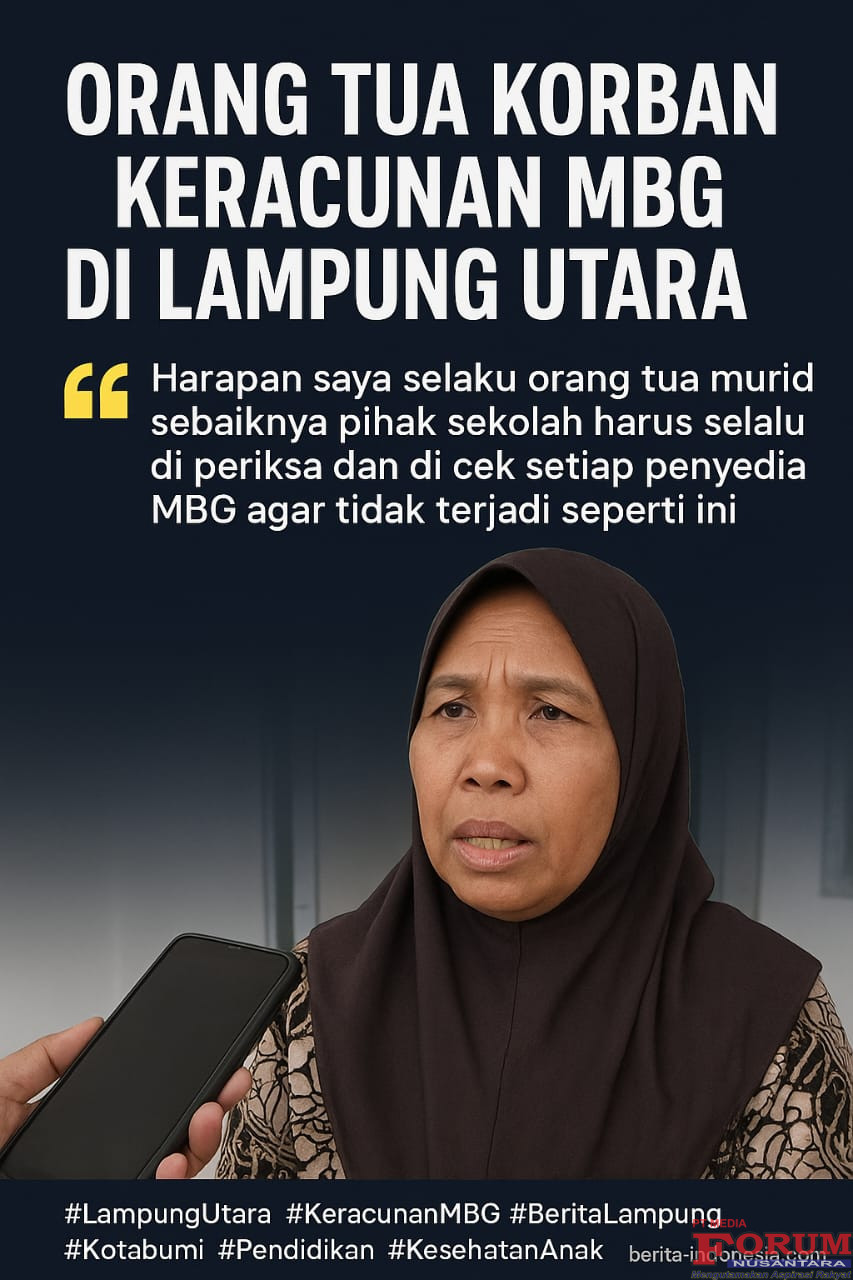 ForumNusantaranews.com LAMPUNG UTARA– Salah satu orang tua korban dugaan keracunan makanan bergizi (MBG) di SMA Negeri 4 Kotabumi, Lampung Utara, menyampaikan harapannya agar pihak sekolah memperketat pengawasan terhadap penyedia makanan. Pernyataan ini disampaikan saat dikonfirmasi awak media melalui pesan WhatsApp, Senin (29/9/2025).