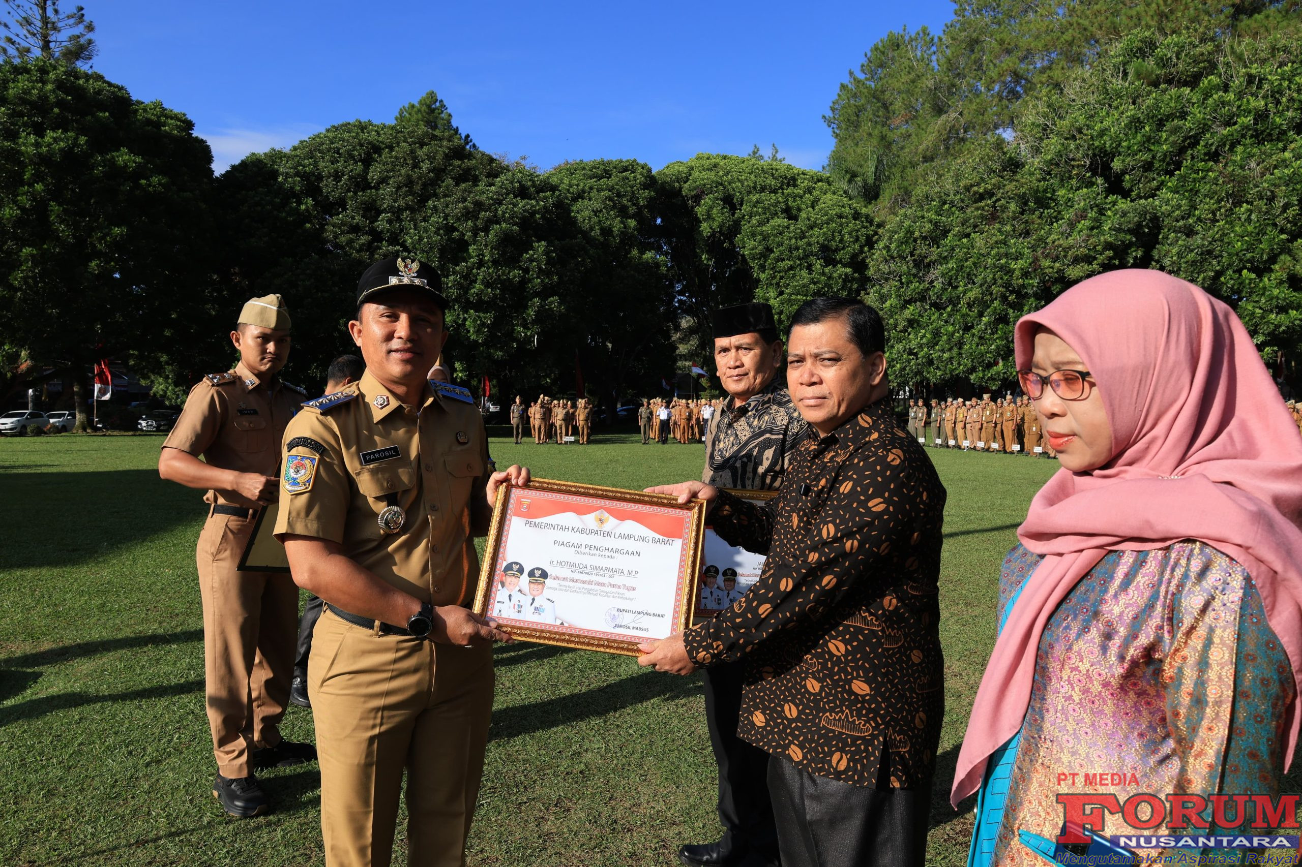 Disela upacara Parosil Mabsus menyerahkan piagam penghargaan kepada empat ASN di Lingkungan Pemda Lambar yang memasuki Purna Tugas per 01 September 2025.