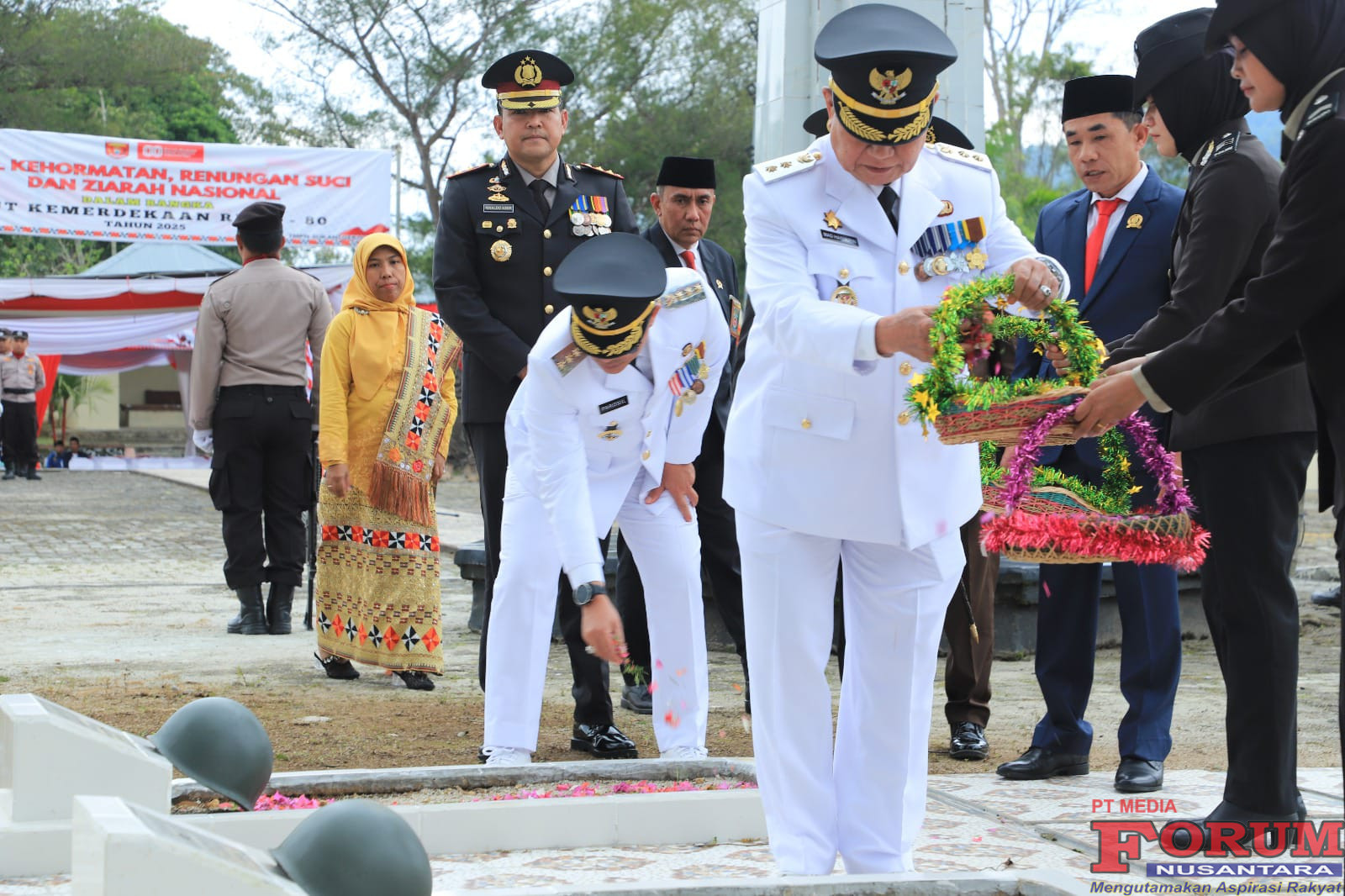 ForumNusantaranews.com Bupati dan Wakil Bupati Lampung Barat Parosil Mabsus – Mad Hasnurin mengikuti Upacara Ziarah Nasional dalam rangka Peringatan Hari Ulang Tahun (HUT) Ke-80 Republik Indonesia di Taman Makam Pahlawan (TMP) Liwa, Pekon Kubuperahu, Kecamatan Balik Bukit, Minggu 17 Agustus 2025.
