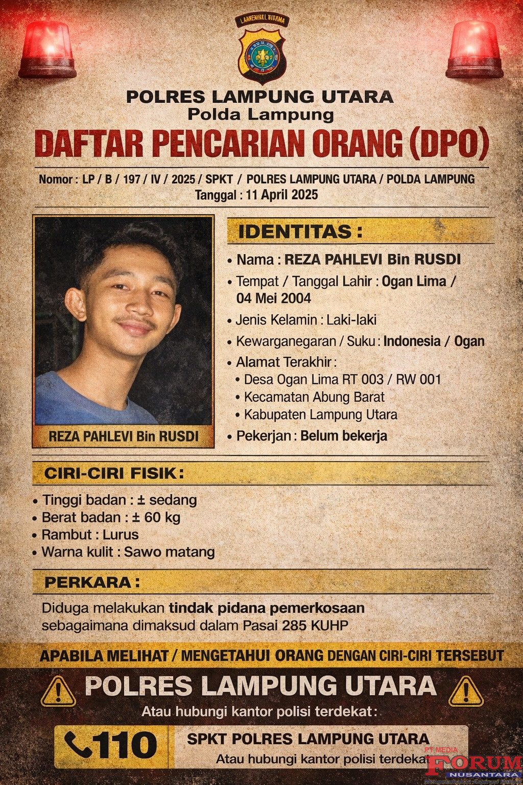 Pihak Polres Lampung Utara mengimbau kepada masyarakat yang mengetahui keberadaan DPO Reza Pahlevi untuk segera melapor ke kantor polisi terdekat.