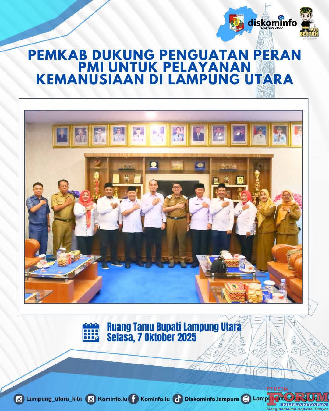 ForumNusantaranews.com Kotabumi – Bupati Lampung Utara Dr. Ir. Hamartoni Ahadis, M.Si. menerima kunjungan pengurus Palang Merah Indonesia (PMI) Kabupaten Lampung Utara di Ruang Tamu Sekretariat Daerah, Selasa (7/10/2025).