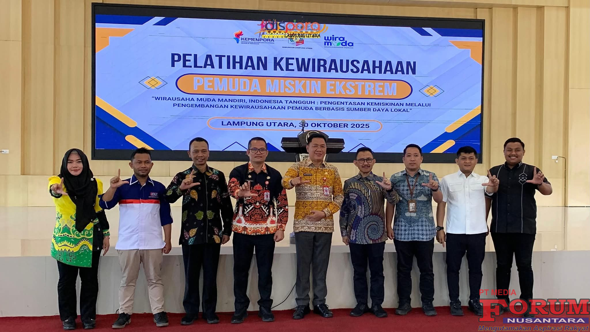 ForumNusantaranews.com LAMPUNG UTARA —30 Oktober 2025. Dalam upaya mempercepat pengentasan kemiskinan dan memperkuat ketahanan ekonomi daerah, Pemerintah Kabupaten Lampung Utara bekerja sama dengan Kementerian Pemuda dan Olahraga (Kemenpora) RI menyelenggarakan Pelatihan Kewirausahaan Pemuda bertema “Wirausaha Muda Mandiri Indonesia Tangguh”.