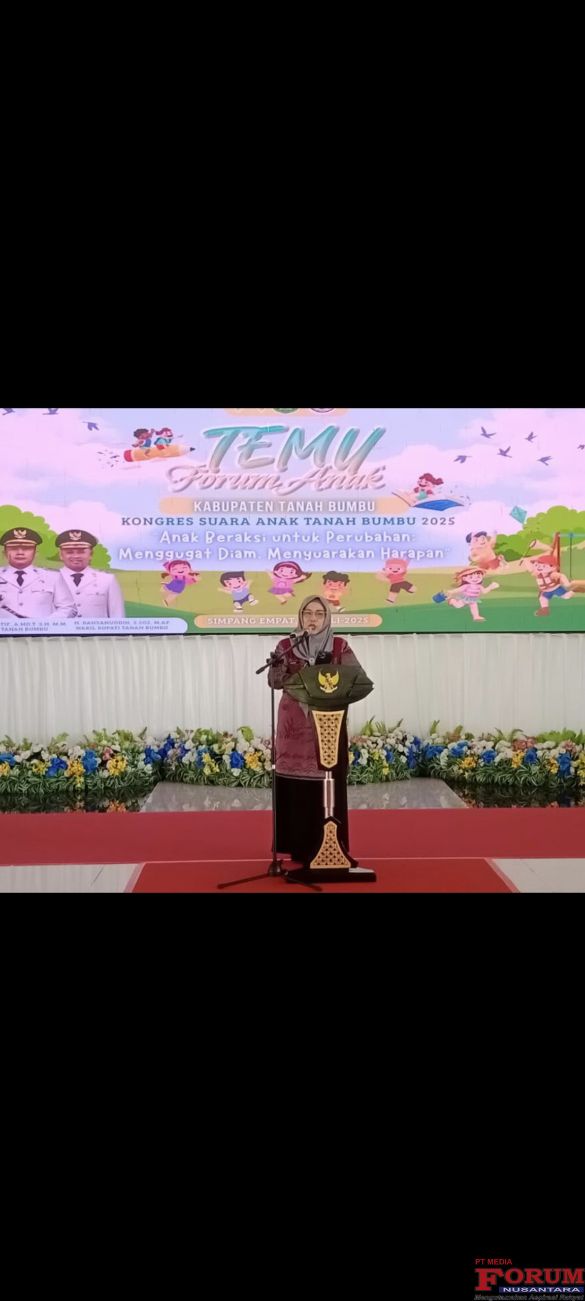 “Atas nama Pemerintah Kabupaten Tanah Bumbu,kami menyambut baik kegiatan temu forum anak ini.Semoga forum ini menjadi langkah awal mencetak generasi penerus bangsa yang unggul dan mampu menciptakan karya nyata,” ujar Hj.Narni membacakan sambutan Bupati.