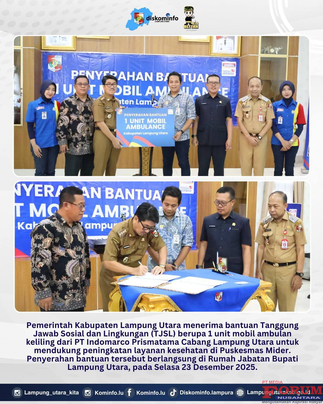 ForumNusantaranews.com Pemerintah Kabupaten Lampung Utara menerima bantuan Tanggung Jawab Sosial dan Lingkungan (TJSL) berupa 1 unit mobil ambulan keliling dari PT Indomarco Prismatama Cabang Lampung Utara untuk mendukung peningkatan layanan kesehatan di Puskesmas Mider. Penyerahan bantuan tersebut berlangsung di Rumah Jabatan Bupati Lampung Utara, pada Selasa 23 Desember 2025.