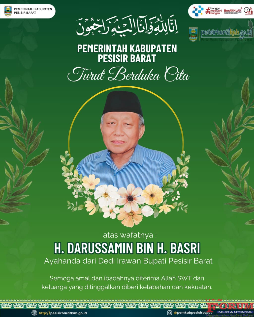 ForumNusantaranews.com PESISIR BARAT-Pemerintah Kabupaten (Pemkab) Pesisir Barat (Pesibar) berduka atas meninggalnya H. Darussamin bin H. Basri yang merupakan ayahanda Bupati, Dedi Irawan, di Unit Pelaksana Teknis Dinas (UPTD) Puskesmas Krui Kecamatan Pesisir Tengah, sekitar Pukul 17.20 WIB, Rabu (4/6/2025) sore.