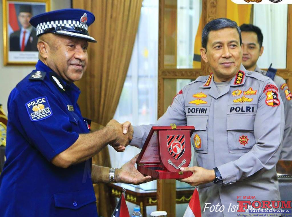 ForumNusantaranews.com Nasional – Wakapolri, Komjen Pol. Drs. Ahmad Dofiri, M.Si., memimpin penerimaan kunjungan kerja Wakil Kepala Kepolisian Papua Nugini, Dr. Philip Mitna, MPA., Ph.D., beserta delegasi di Ruang Perjamuan, Mabes Polri, Jakarta Selatan, Senin (19/5).