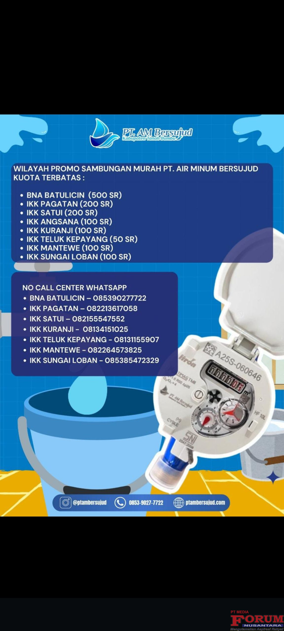 Tanah Bumbu,Selasa 28 Oktober 2025.PT.Air Minum Bersujud Kabupaten Tanah Bumbu (PT.AMB) menggelar promo manfaat pemasangan sambungan baru dalam rangka menjelang Akhir Tahun 2025,PT.Air Minum Bersujud Hadirkan Promo diskon untuk masyarakat. Promo ini berlangsung dari sekarang ini,hingga batas Akhir tanggal 15 Nopember 2025,dengan Kuota berbatas. kepada warga masyarakat yang ingin memasang sambungan baru air bersih ini di khususkan yang berada di wilayah-wilayah yang memang sudah ada pipa jaringan dan terbilang lancar pendistribusian terhadap suplai air bersih PT.Air Minum Bersujud Tanah Bumbu.