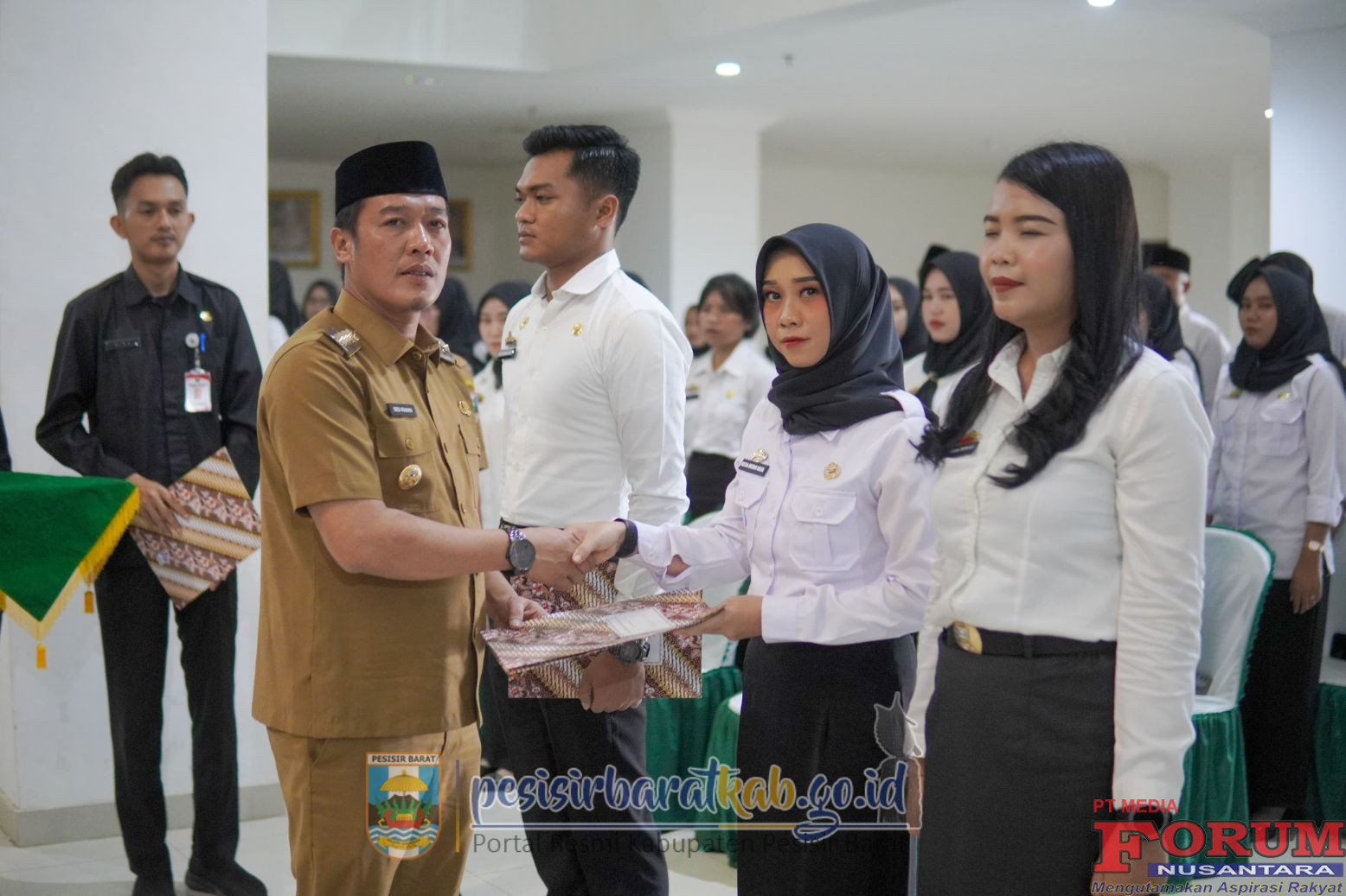 ForumNusantaranews.com PESISIR BARAT-Bupati Pesisir Barat (Pesibar), Dedi Irawan resmi menyerahkan perikan Surat Keputusan (SK) Bupati terhadap satu orang Calon Pegawai Negeri Sipil (CPNS) lulusan Institut Pemerintahan Dalam Negeri (IPDN) dan 81 orang Pegawai Pemerintah dengan Perjanjian Kerja (PPPK) Periode II Tahun 2025, di Lobby Teluk Stabas, Lantai 1 Gedung Marga Sai Batin Komplek Perkantoran Pemkab Pesibar, Senin (27/10/2025).