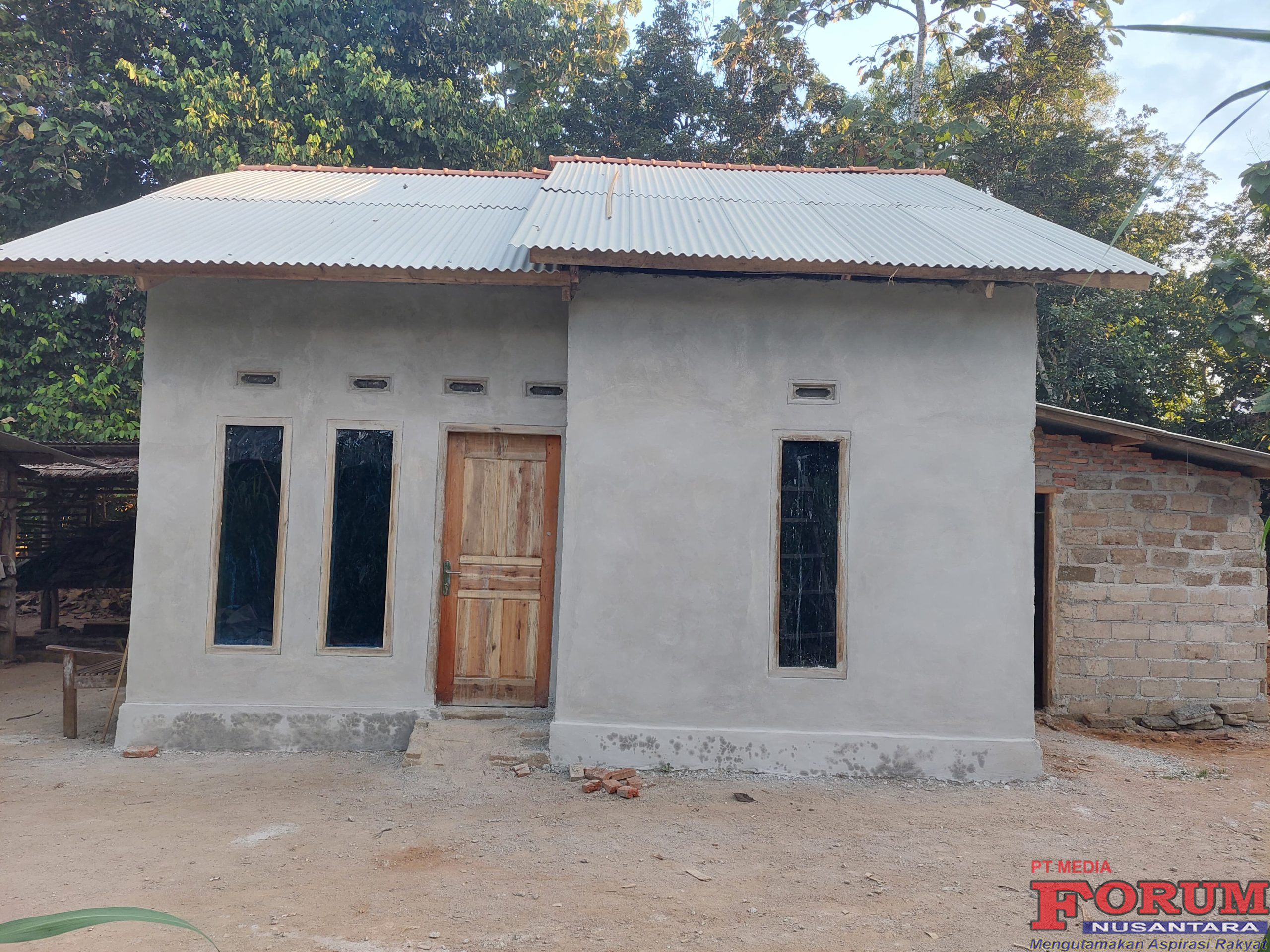 Pembangunan rumah ukuran sedang ini kini memasuki tahap akhir. Dapur sudah dipasang lantai, dan aliran listrik dari PLN telah tersambung.