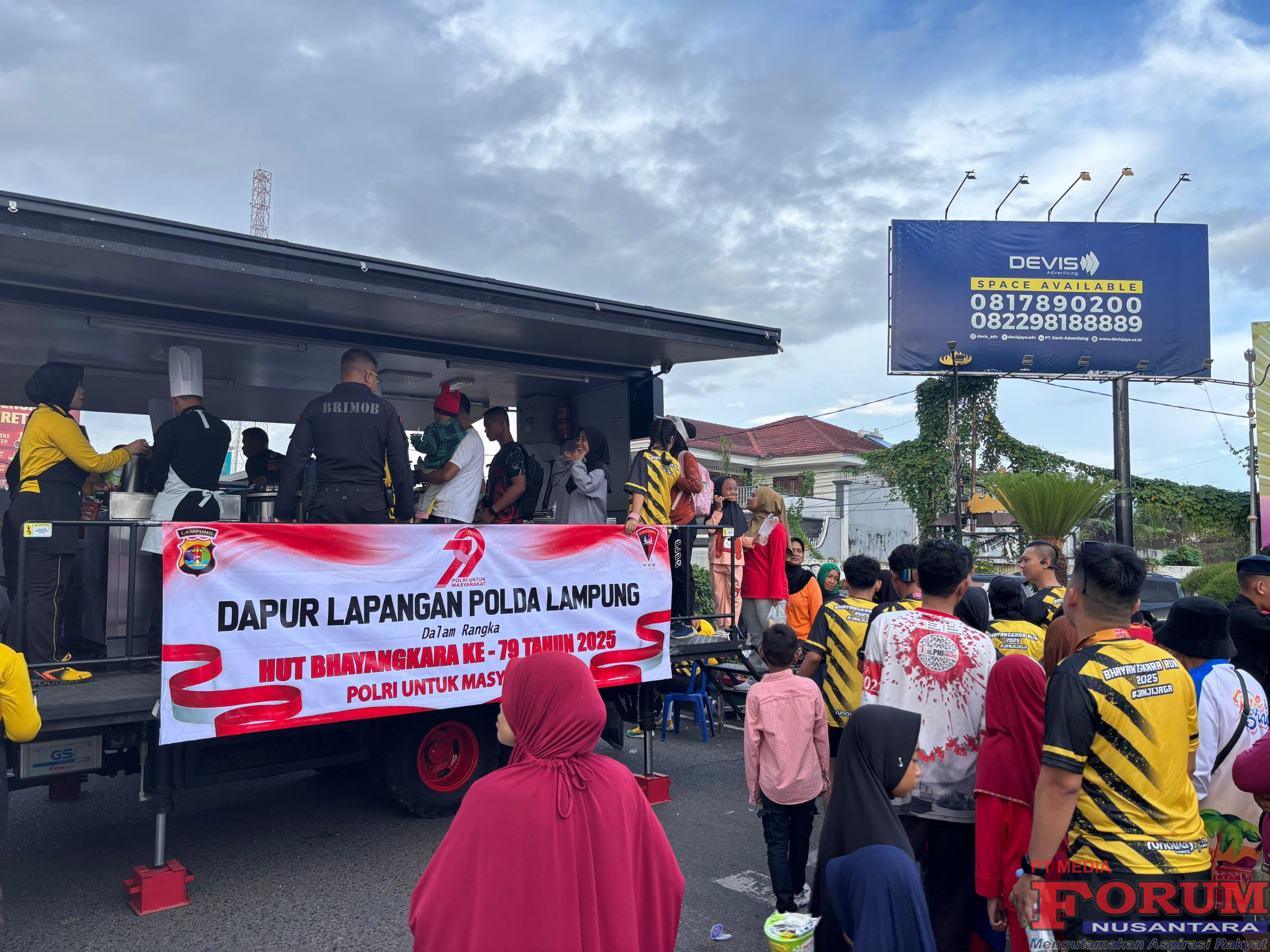 ForumNusantaranews.com LAMPUNG – Memeriahkan peringatan Hari Bhayangkara ke-79, Satbrimobda Polda Lampung menyediakan dapur umum gratis bagi ratusan peserta Bhayangkara Run 2025 yang digelar di sekitar Tugu Adipura. Inisiatif ini merupakan wujud nyata kedekatan Brimob dengan masyarakat. Minggu(22/6/25)