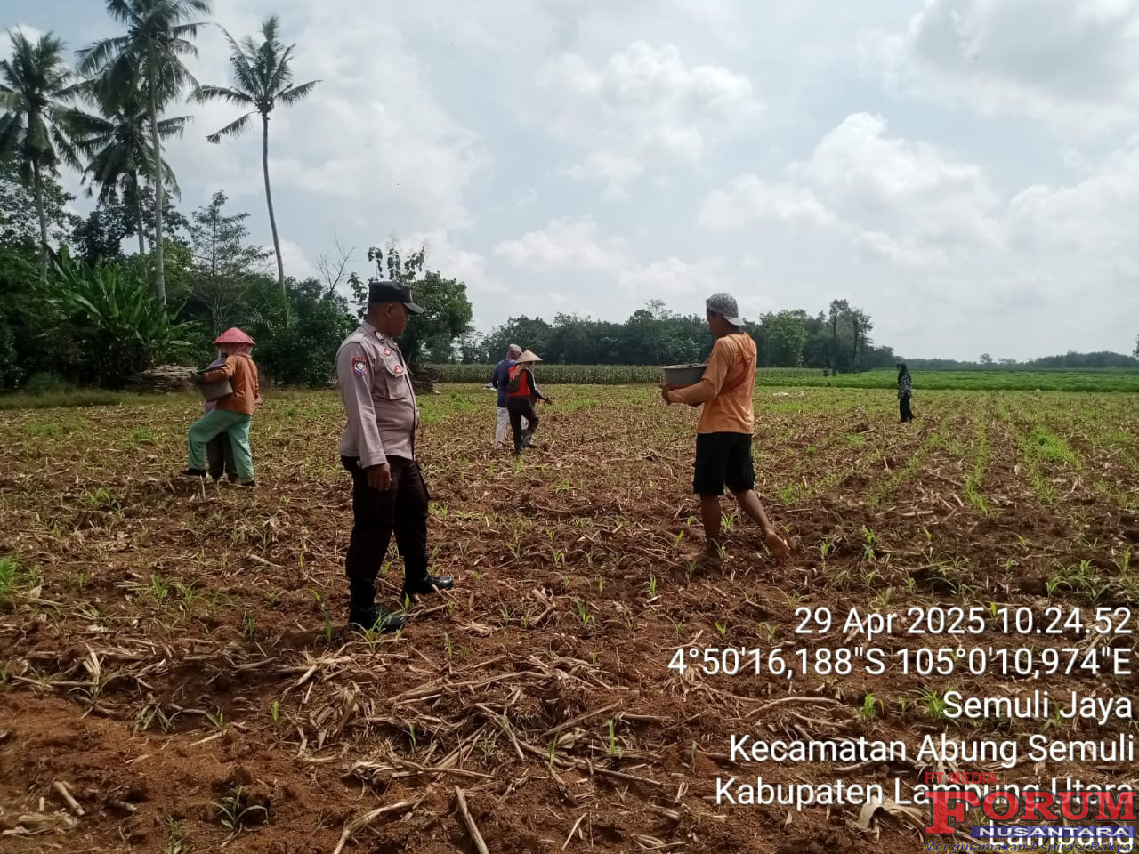 ForumNusantaranews.com LAMPUNG UTARA– Bhabinkamtibmas Polsek Abung Semuli Polres Lampung Utara Bripka Yuli Maryanto membantu Petani saat melakukan penanaman jagung di Dusun Sukajadi Desa Sukamaju Kecamatan Abung Semuli Kabupaten Setempat. Selasa (29/4/25).