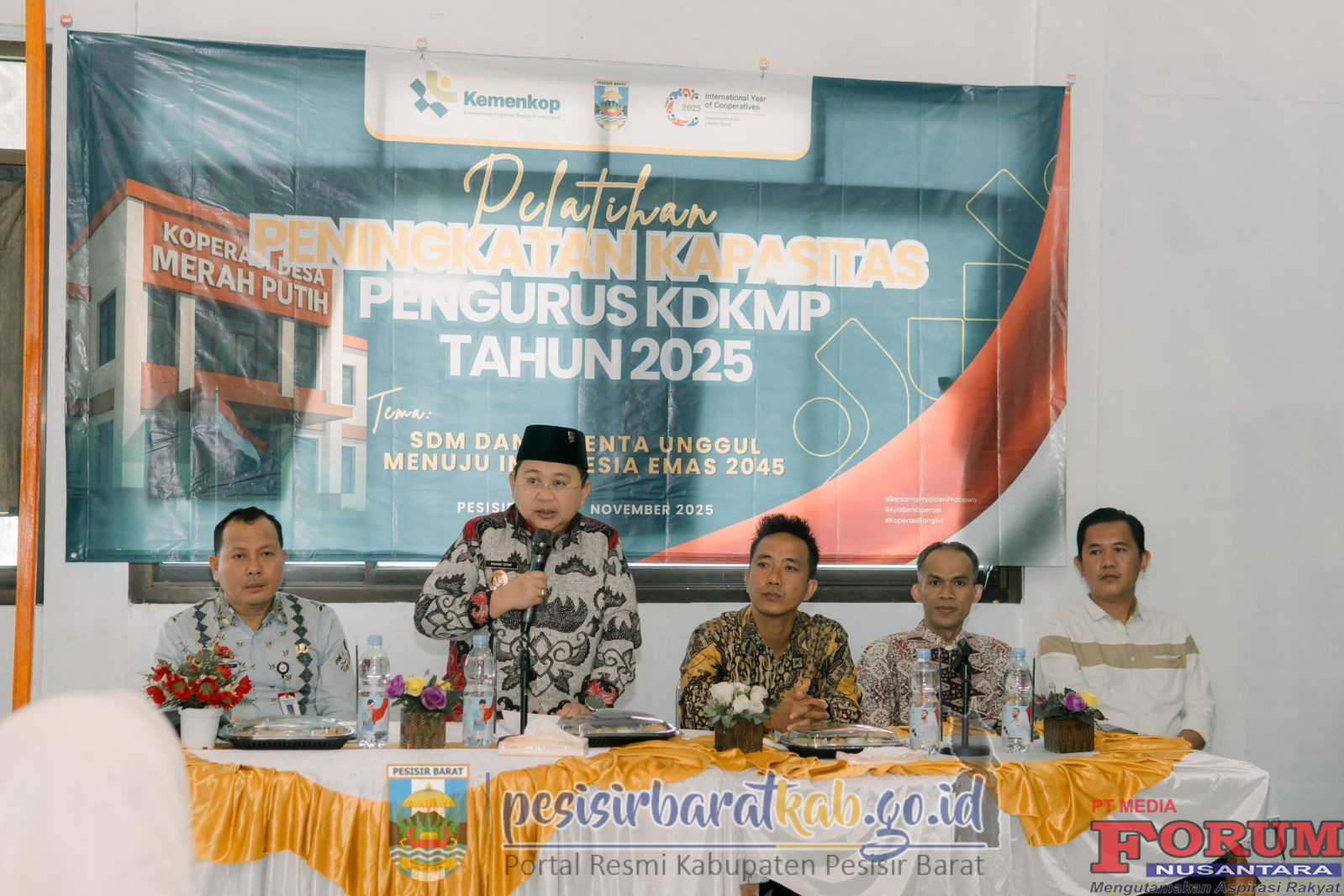 ForumNusantaranews.com PESISIR BARAT-Wakil Bupati Pesisir Barat (Pesibar), Irawan Topani, S.H., M.Kn., membuka kegiatan Peningkatan Kompetensi Sumber Daya Manusia (SDM) Pengurus Koperasi Desa/Kelurahan Merah Putih (KDKMP), di Aula Hotel Sunset Beach Pekon Way Redak Kecamatan Pesisir Tengah, Kamis (13/11/2025).