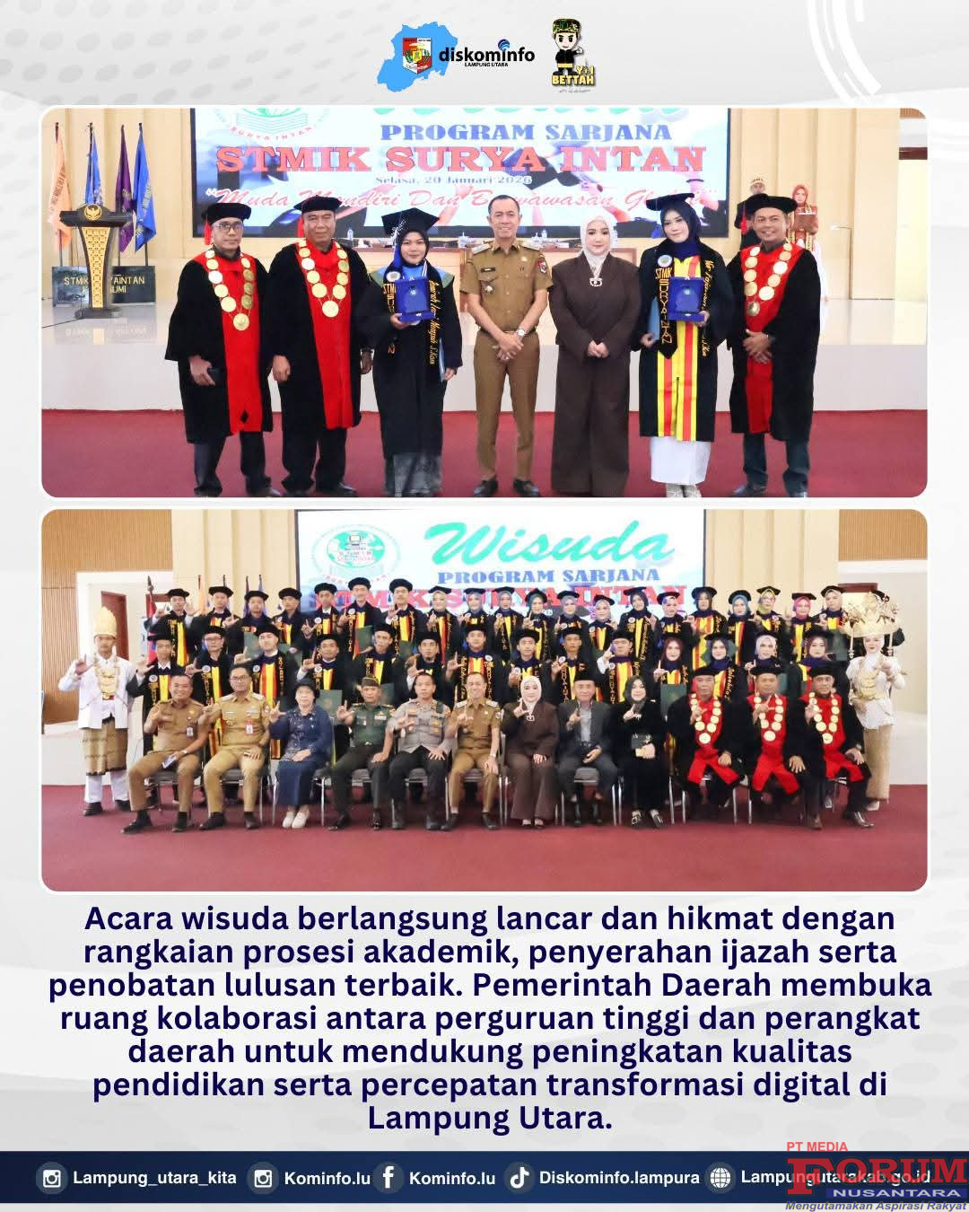 ForumNusantaranews.com Wakil Bupati Lampung Utara Romli, S.Kom., S.H., M.H. menghadiri sekaligus memberikan sambutan pada acara Wisuda Sekolah Tinggi Manajemen Informatika dan Komputer (STMIK) Surya Intan Kotabumi Tahun 2026 di Gedung Pusiban Agung Kotabumi, Senin 20 Januari 2026 didampingi jajaran Kepala OPD.